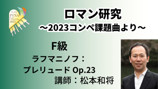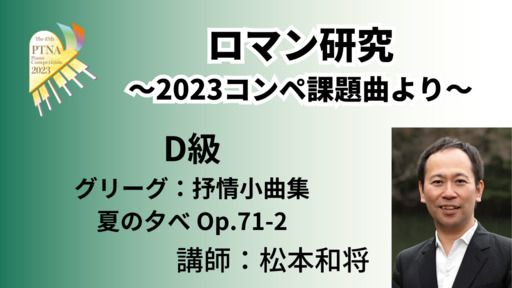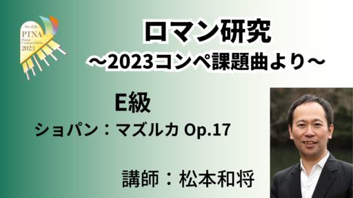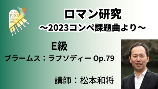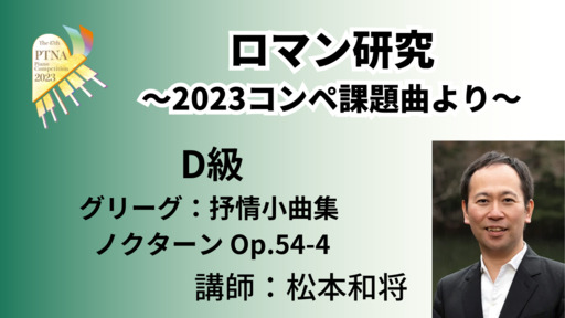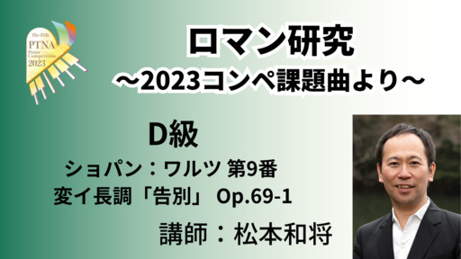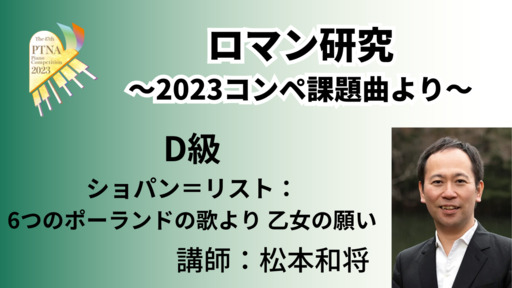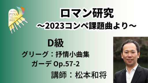 2023年度課題曲説明会で素晴らしいロマン期の演奏・解説をいただいた松本和将先生による特別講座。2023年D級課題曲から、ロマンスタイルの演奏方法について考えていきます。